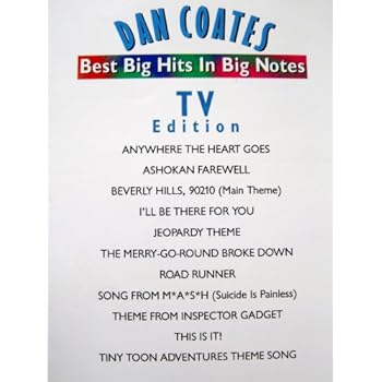 Big Note Piano Version of TV themes with lyrics. 11 Selections including Ashokan Farewell, I'll Be there for You, Jeopardy Theme, This Is It (Bugs Bunny) and more. 32 pages. Read more