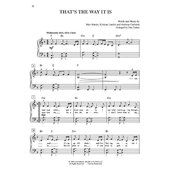 For more than 20 years, Celine Dion has been a fixture on the pop charts. This collection of intermediate-level piano arrangements encompasses her biggest hits. Lyrics and chord symbols are included. Titles: All By Myself * Beauty and the Beast (Duet with Peabo Bryson) * Because You Loved Me (Theme from Up Close & Personal) * Dance With My Father * I Knew I Loved You * I'm Alive * I'm Your Angel (Duet with R. Kelly) * If You Asked Me To * It's All Coming Back to Me Now * Love Can Move Mountains * My Heart Will Go On (Love Theme from Titanic) * The Power of Love * The Prayer (Duet with Andrea Bocelli) * Taking Chances * That's The Way It Is * To Love You More.
